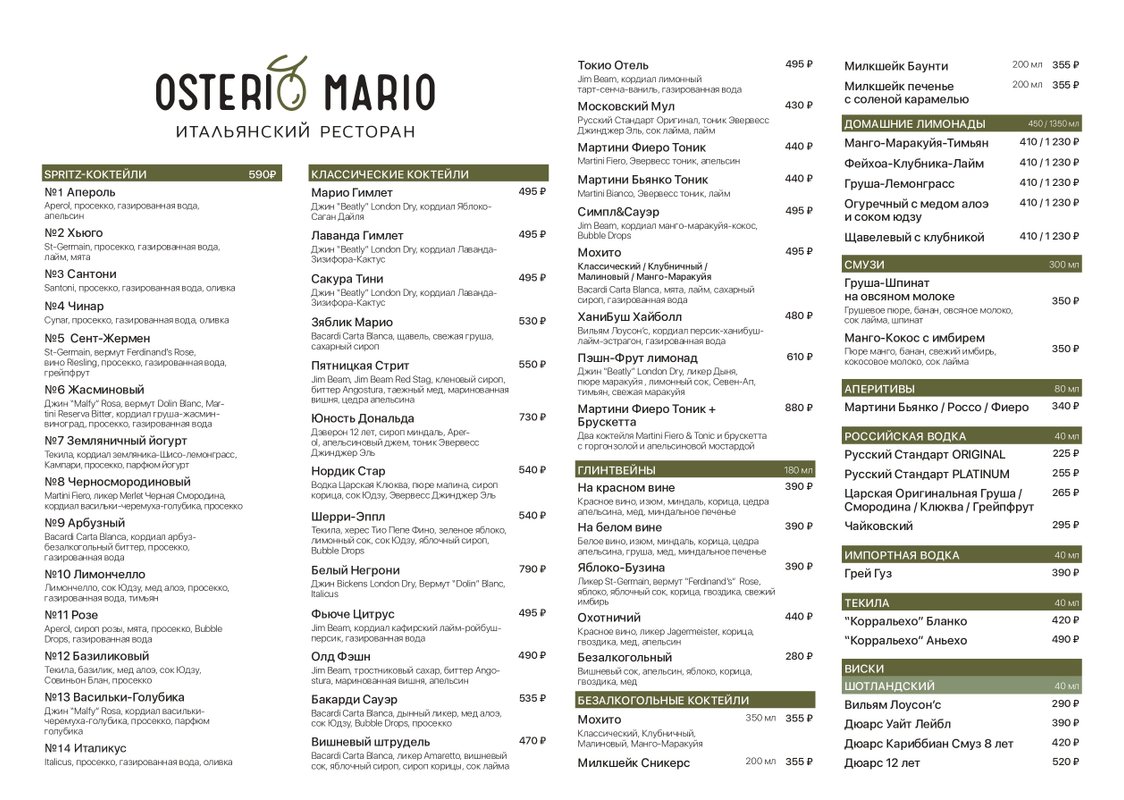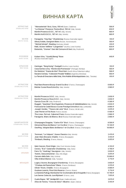 Наше заведение - домашний итальянский ресторан Osterio Mario - это винный бар, где вы можете приятно провести время с друзьями или просто как следует отдохнуть после рабочего дня, а в этом вам с удовольствием помогут наши опытные бармены и ассортимент алкоголя. Они посоветуют варианты горячительного по вкусу и кошельку! Вам нужно лишь рассказать, что предпочитаете: желаемый градус и вкус (сладкий или горьковатый). В нашей винной карте мы предлагаем большой выбор сухих, полусладких, крепких вин из различных сортов винограда.